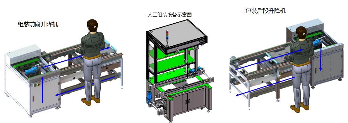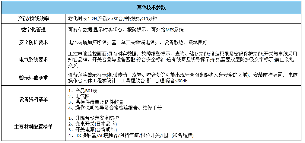 升降臺 | 1.測試完成機器送入直通導或老化架老化層; 2.接駁老化后包裝工作臺 | 感應/限位 | 1套 | |
