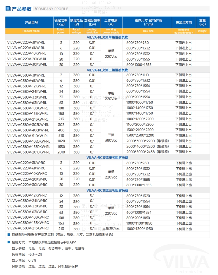 產(chǎn)品規(guī)格:VILVA-RL/RC交流單/三相阻感/阻容負(fù)載箱