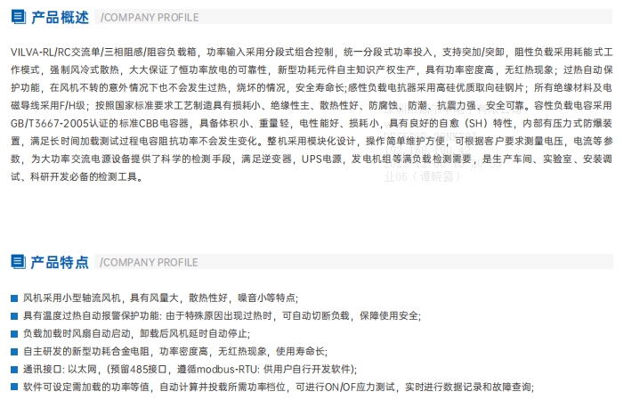 產(chǎn)品簡述:VILVA-RL/RC交流單/三相阻感/阻容負(fù)載箱,功率輸入采用分段式組合控制,統(tǒng)一分段式功率投入,支持突加/突卸,阻性負(fù)載采用耗能式工作模式