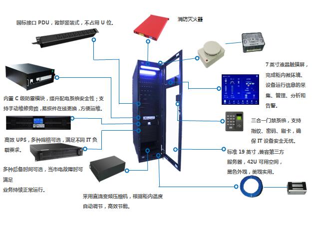 1、一體化設(shè)計(jì),集成IT機(jī)柜,精密 空調(diào)配電,UPS、蓄電池,動(dòng)環(huán)監(jiān)控
