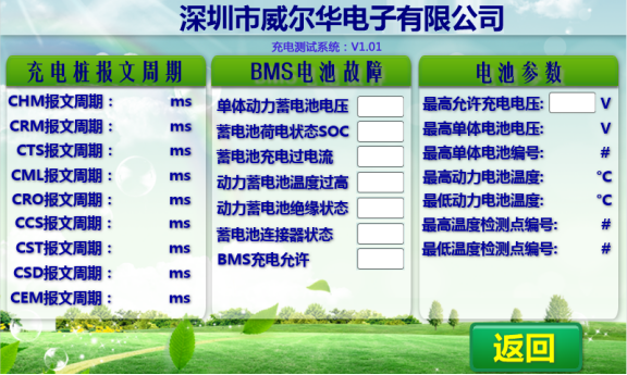 該測試負(fù)載通過內(nèi)部BMS 模擬器與電動汽車直流充電樁進(jìn)行信息交互,實(shí)現(xiàn)對電池充電過程的實(shí)時模擬與檢測,可以檢測多種規(guī)格的直流充電樁電壓范圍500/1000VDC,測試系統(tǒng)內(nèi)部集成了125KW的負(fù)載(功率大小及電壓范圍都可根據(jù)客戶實(shí)際要求定制)。本測試負(fù)載測試邏輯主要以GB18487-2015中直流充電控制導(dǎo)引為測試依據(jù)。當(dāng)直流充電機(jī)充電槍接入測試設(shè)備接口時,測試設(shè)備按非車載充電機(jī)與BMS 通信協(xié)議國標(biāo)(GB/T 27930-2015)完成連接檢測、充電握手、配置和充電,檢測充電電壓和輔助電源狀態(tài)。